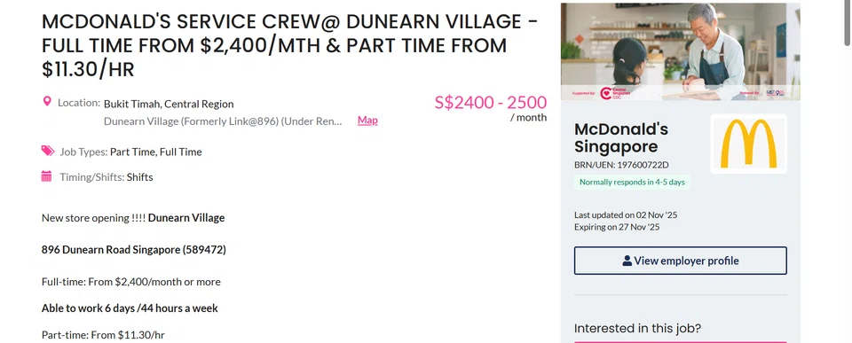 A recent FastJobs advertisement by McDonald's Singapore states that it is hiring service crew for its new Dunearn Village outlet, with the caption: "New store opening!!!!"
