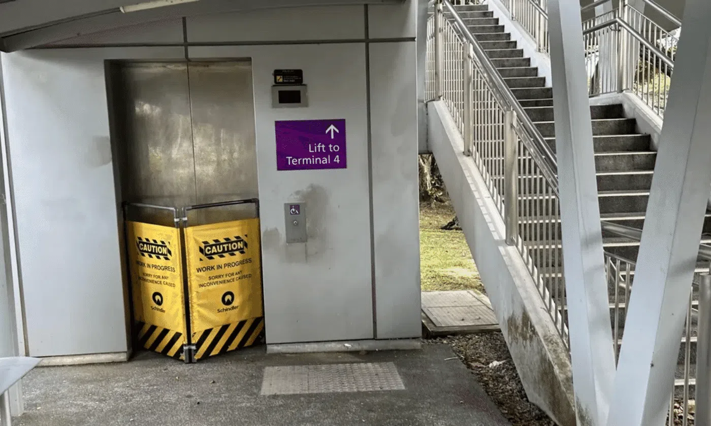Reddditor @Low_Debt_5937 posted an image on Nov 18 showing a lift to T4, located next to a staircase, with a "work in progress" barrier at its entrance.