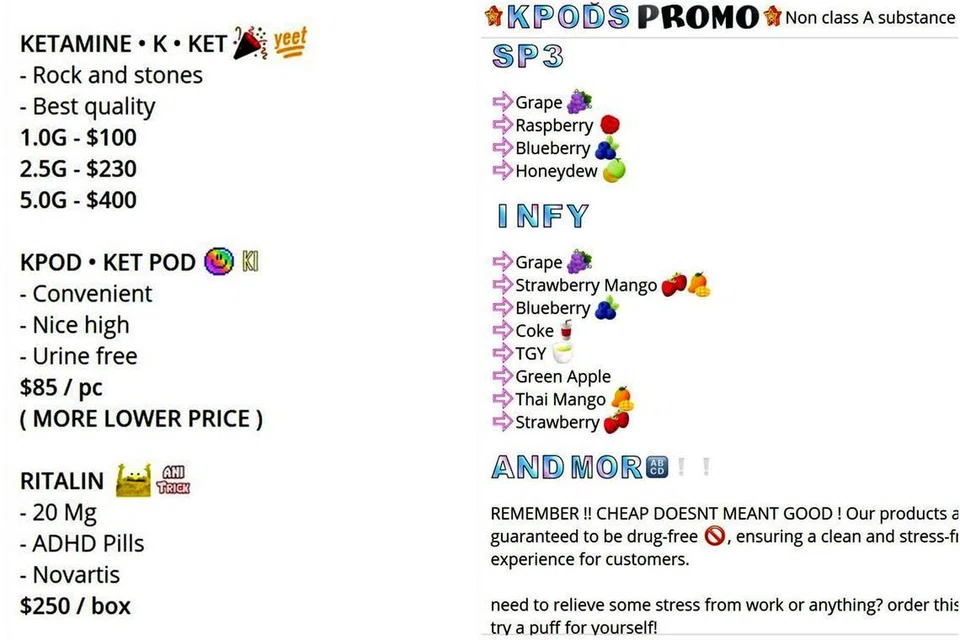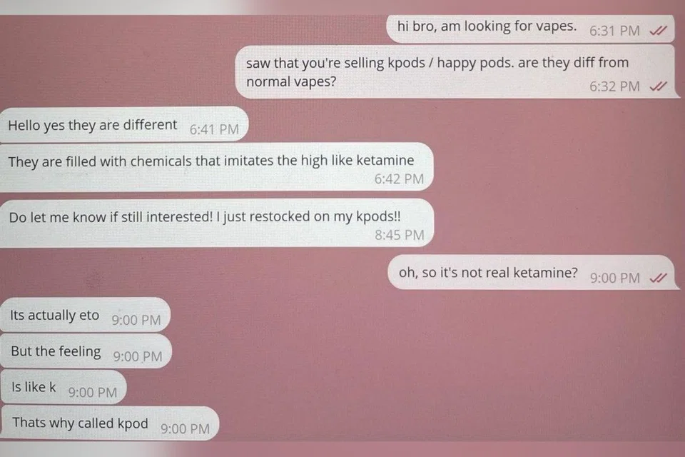 Some sellers in the Telegram groups claimed they also sell vape liquid with ketamine. Ketamine, which can be used as an anaesthetic in emergency care for pain relief or short surgical procedures, is listed as a Class A controlled drug in Singapore. It is illegal to traffic, make, import, export, possess or consume the drug.