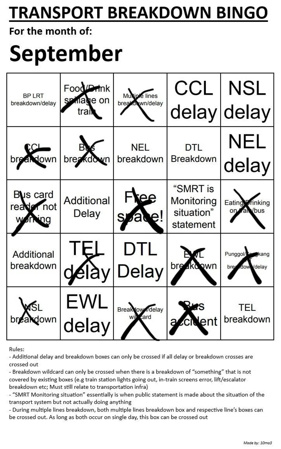 In a humorous twist, some netizens have created a bingo card to track the MRT breakdowns, delays, and other incidents that occurred in September.