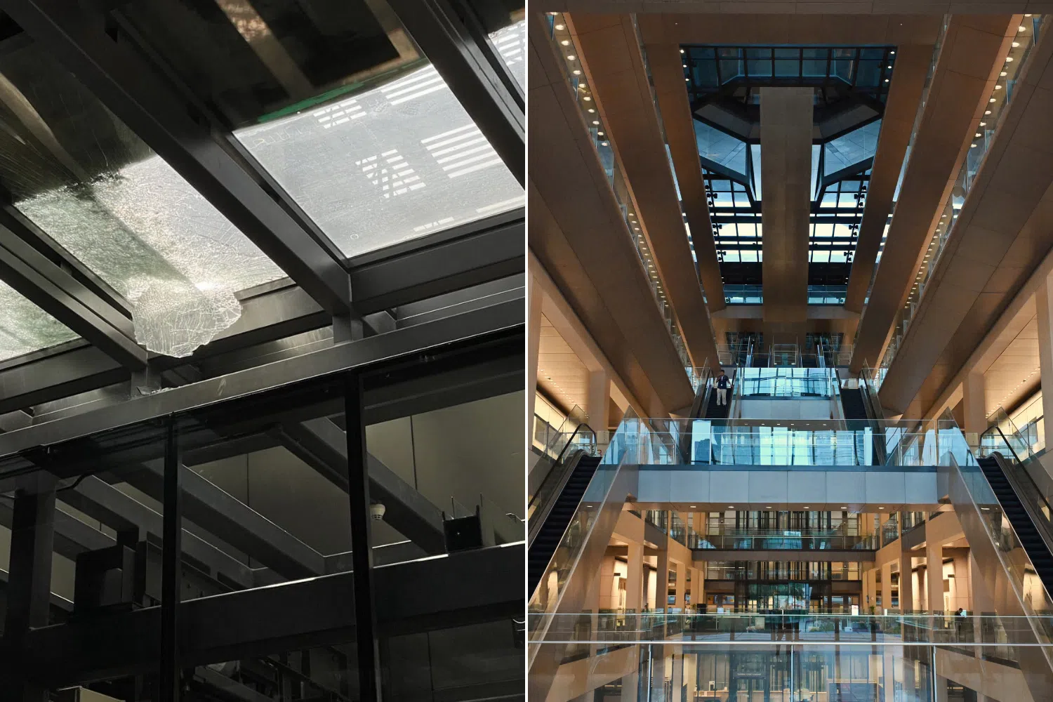 A loud crash was heard in the lift lobby area at about 2pm when the loose panel hit a secondary glass roof, and glass fragments landed on the roof of the lift car she was in, triggering a safety mechanism that halted the lift.