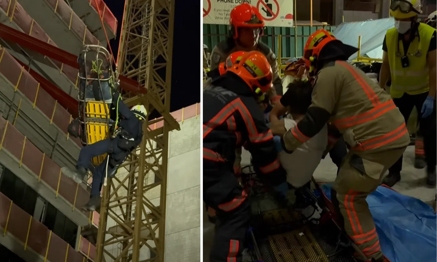 The man, who was inside the crane cabin, was given water and oxygen by SCDF personnel, before he was secured to a stretcher and lowered to the ground.