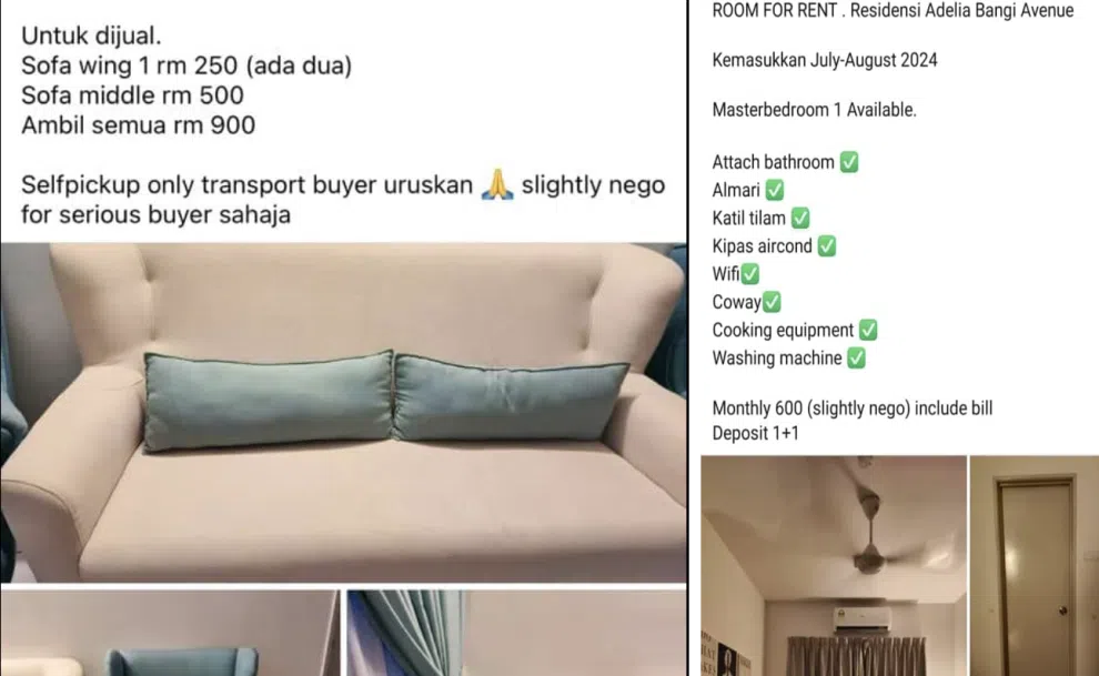 The ads carried the message "urgent sale as I need the money to survive" and listed the pieces of furniture at very low prices, such as RM150 ($43) for a pair of upholstered armchairs with footrests.