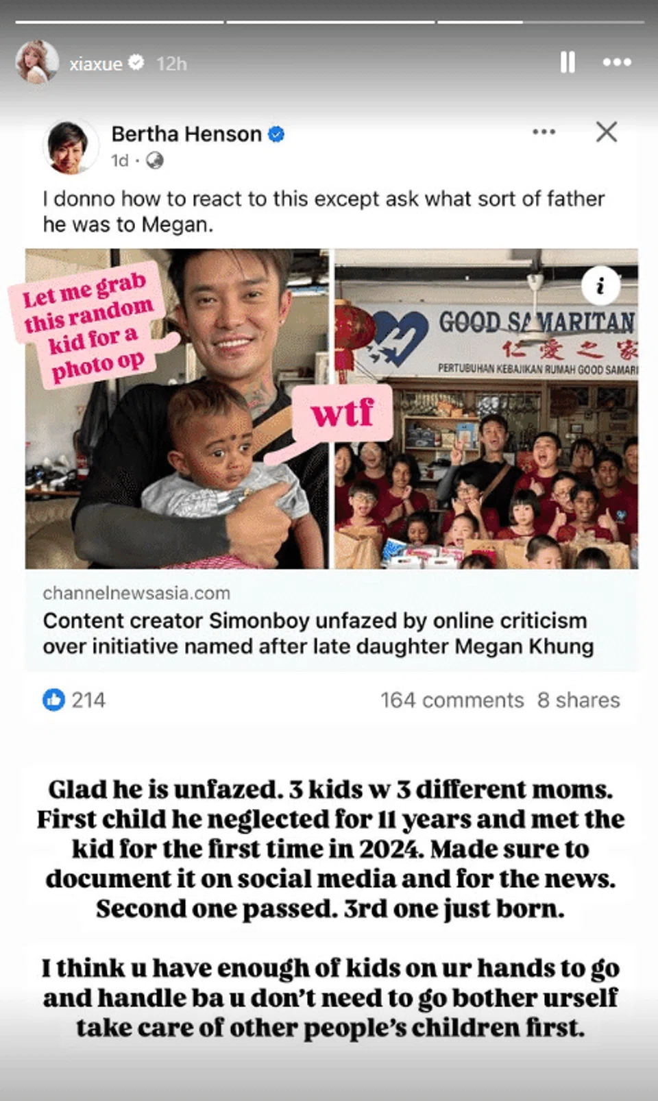 On her Instagram stories on Nov 12, Xiaxue shared a screenshot of former Straits Times news editor Bertha Henson's repost of a CNA article that said Simonboy was "unfazed" by online criticism over his latest initiative. "I donno how to react to this except ask what sort of father he was to Megan," said Ms Henson.
