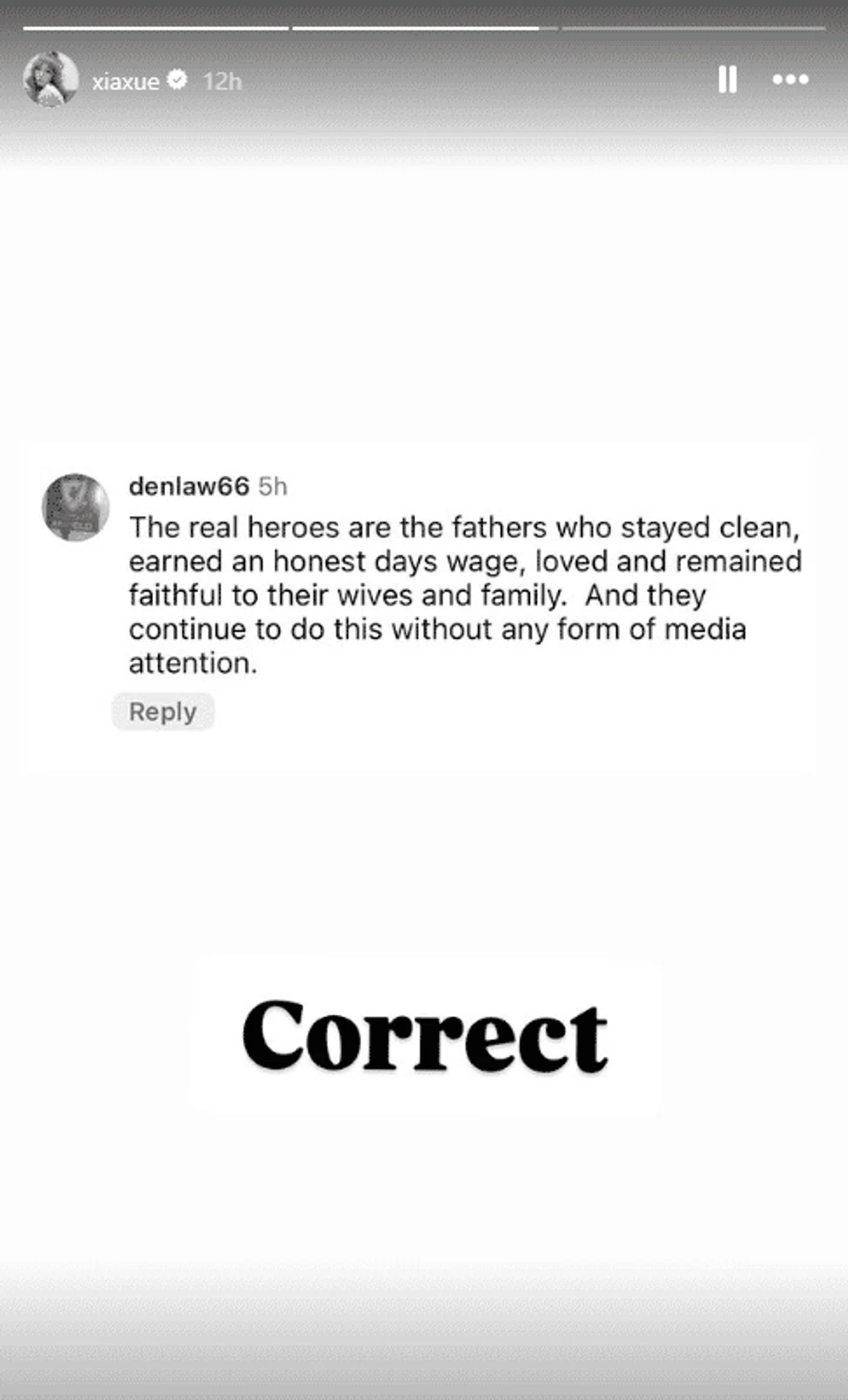In an earlier Instagram story, she shared a screenshot of a comment that read: "The real heroes are the fathers who stayed clean, earned an honest day's wage, loved and remained faithful to their wives and family. And they continue to do this without any form of media attention."