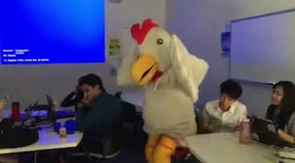 It is unclear why the lecturer decided to do a chicken dance, but the students are obviously loving it.
